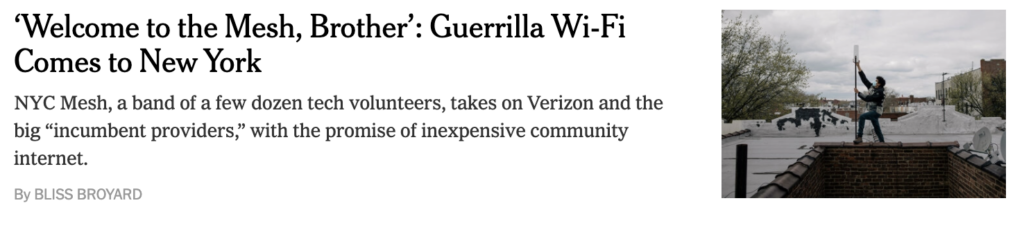 - Conflict: Everyone loves an underdog story. Especially when it’s a volunteer group of NYC volunteers “taking on Verizon and the big incumbent providers”, but also there’s the complex conflict of the haves vs. have nots.