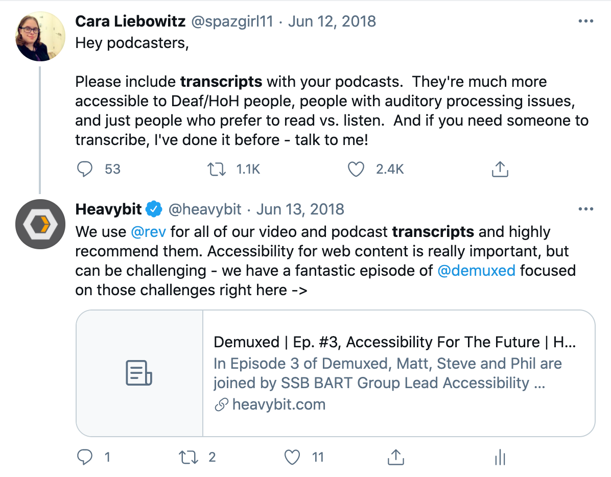The feedback we get most often from listeners is, “Thanks for providing time-coded transcripts.” Transcribing is time and resource intensive but the payoffs are high; transcripts provide accessibility to folks with hearing disabilities, cater to folks who prefer to read, and make your show discoverable to search engines. We recommend using a service like Rev for reliable and fast transcripts. At the very least, include a time-stamped outline with every episode.